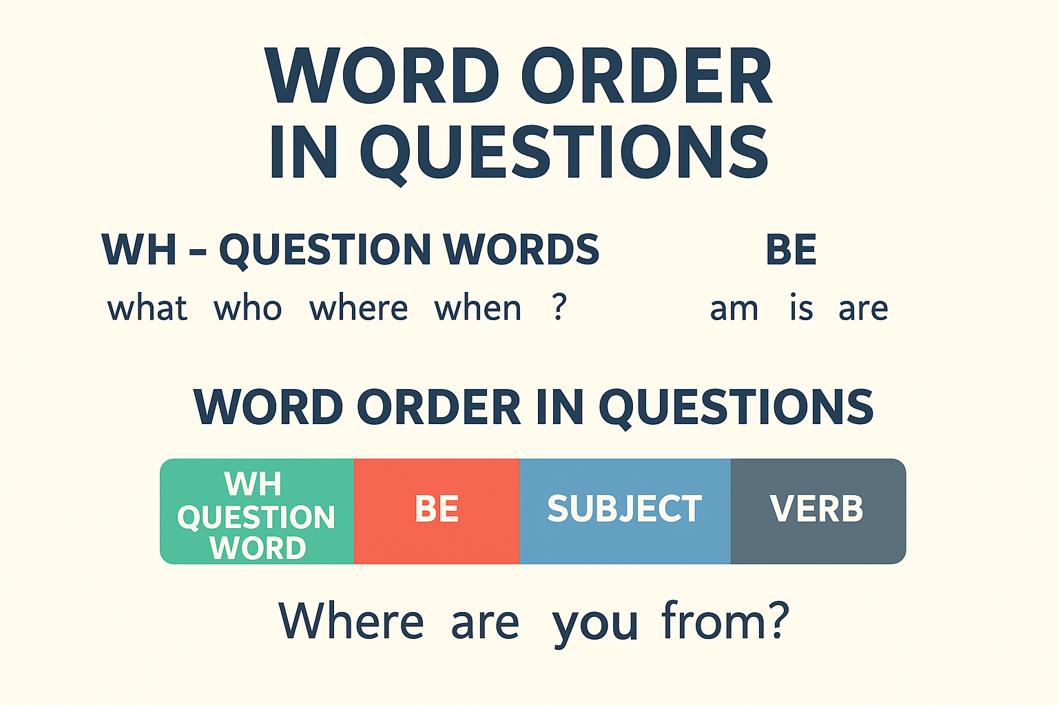- WH-kérdések: WH-word + Auxiliary + Subject + Verb…