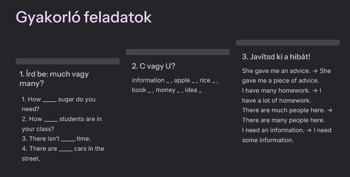 - Hogyan tesszük megszámlálhatóvá a megszámlálhatatlan főneveket? (csak érintőlegesen, A2 szinten).