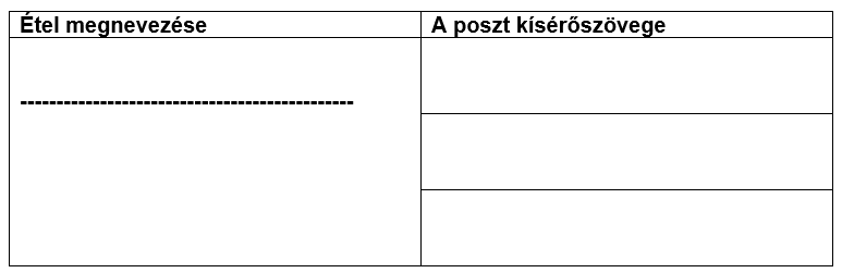 Keress egy étellel kapcsolatos posztot a közösségi médiában, és elemezd az alábbi szempontok alapján: