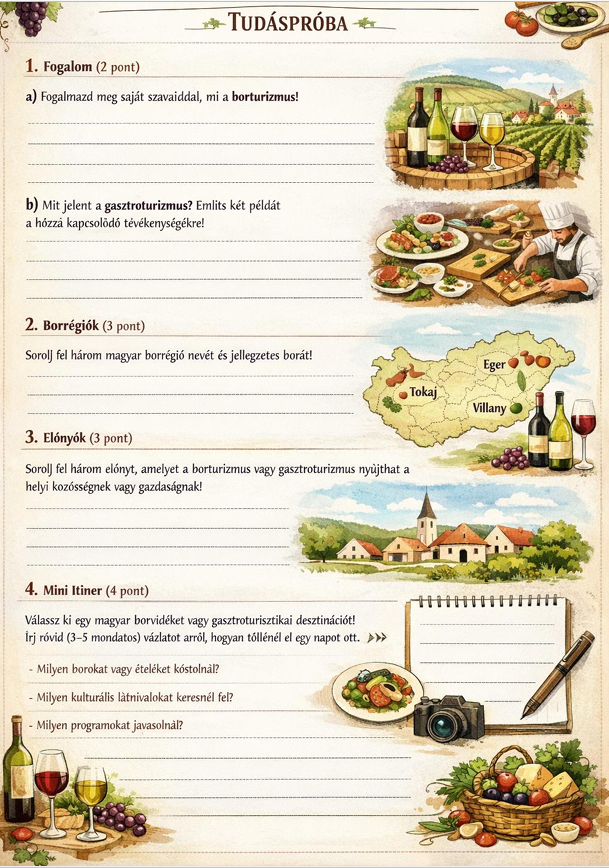 - egyszerű definíciók megértése (borturizmus, gasztroturizmus)